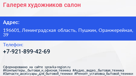 Галерея художников, салон по адресу 196601, Ленинградская область, Пушкин, Оранжерейная, 39 в дальнейшем Организация, размещена в следующих категориях: