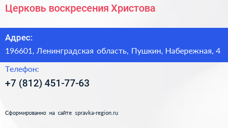Церковь воскресения Христова по адресу 196601, Ленинградская область, Пушкин, Набережная, 4 в дальнейшем Организация, размещена в следующих категориях: