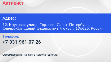 Активист по адресу 12, Круговая улица, Тярлево, Санкт-Петербург, Северо-Западный федеральный округ, 196625, Россия в дальнейшем Организация, размещена в следующих категориях: