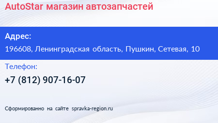 AutoStar, магазин автозапчастей по адресу 196608, Ленинградская область, Пушкин, Сетевая, 10 в дальнейшем Организация, размещена в следующих категориях: