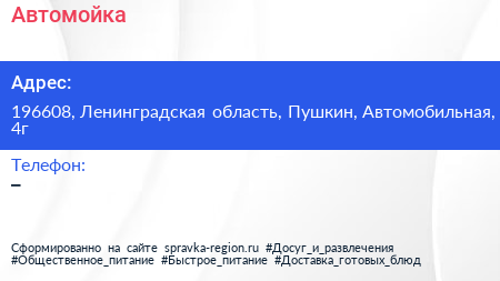 Автомойка по адресу 196608, Ленинградская область, Пушкин, Автомобильная, 4г в дальнейшем Организация, размещена в следующих категориях: