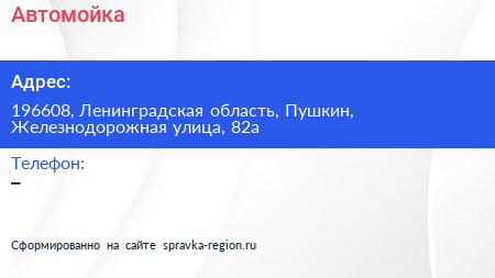 Автомойка по адресу 196608, Ленинградская область, Пушкин, Железнодорожная улица, 82а в дальнейшем Организация, размещена в следующих категориях: