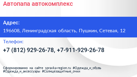Автопапа, автокомплекс по адресу 196608, Ленинградская область, Пушкин, Сетевая, 12 в дальнейшем Организация, размещена в следующих категориях: