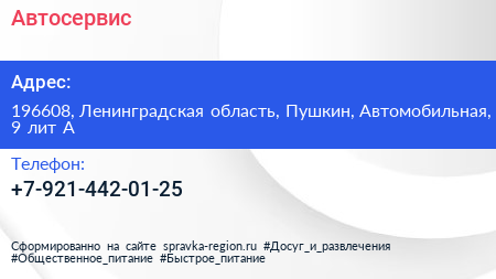 Автосервис по адресу 196608, Ленинградская область, Пушкин, Автомобильная, 9 лит А в дальнейшем Организация, размещена в следующих категориях: