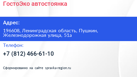 ГостоЭко, автостоянка по адресу 196608, Ленинградская область, Пушкин, Железнодорожная улица, 51а в дальнейшем Организация, размещена в следующих категориях: