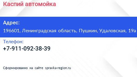 Каспий, автомойка по адресу 196601, Ленинградская область, Пушкин, Удаловская, 19а в дальнейшем Организация, размещена в следующих категориях: