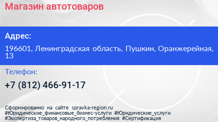 Магазин автотоваров по адресу 196601, Ленинградская область, Пушкин, Оранжерейная, 13 в дальнейшем Организация, размещена в следующих категориях: