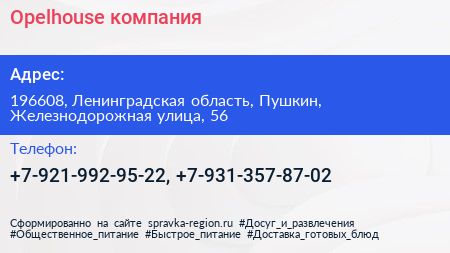Opelhouse, компания по адресу 196608, Ленинградская область, Пушкин, Железнодорожная улица, 56 в дальнейшем Организация, размещена в следующих категориях: