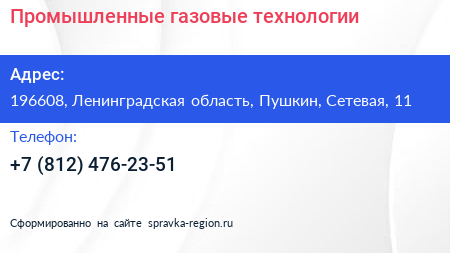 Промышленные газовые технологии по адресу 196608, Ленинградская область, Пушкин, Сетевая, 11 в дальнейшем Организация, размещена в следующих категориях: