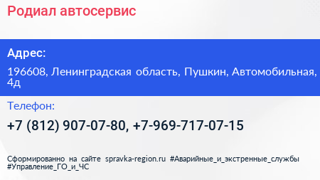 Родиал, автосервис по адресу 196608, Ленинградская область, Пушкин, Автомобильная, 4д в дальнейшем Организация, размещена в следующих категориях: