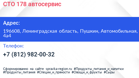 СТО-178, автосервис по адресу 196608, Ленинградская область, Пушкин, Автомобильная, 4а4 в дальнейшем Организация, размещена в следующих категориях: