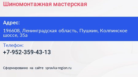 Шиномонтажная мастерская по адресу 196608, Ленинградская область, Пушкин, Колпинское шоссе, 35а в дальнейшем Организация, размещена в следующих категориях: