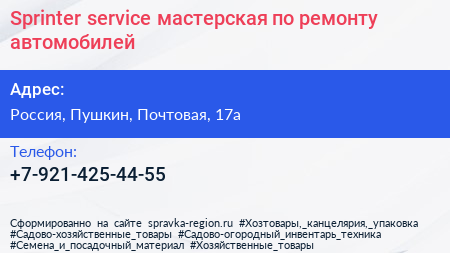 Sprinter-service, мастерская по ремонту автомобилей по адресу 25А, Почтовая улица, Фёдоровское, Фёдоровское городское поселение, Тосненский район, Ленинградская область, Северо-Западный федеральный округ, 187021, Россия в дальнейшем Организация, размещена в следующих категориях: