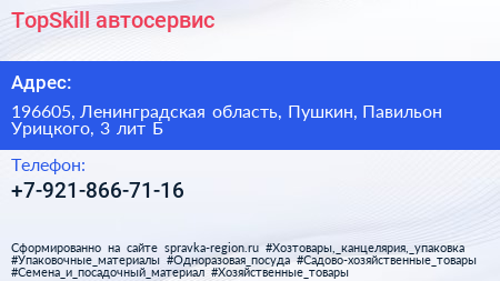 TopSkill, автосервис по адресу 196605, Ленинградская область, Пушкин, Павильон Урицкого, 3 лит Б в дальнейшем Организация, размещена в следующих категориях: