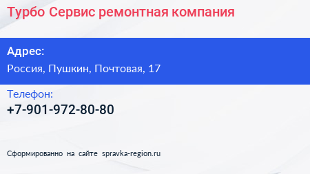 Турбо-Сервис, ремонтная компания по адресу 17, Почтовая улица, Фёдоровское, Фёдоровское городское поселение, Тосненский район, Ленинградская область, Северо-Западный федеральный округ, 187021, Россия в дальнейшем Организация, размещена в следующих категориях:
