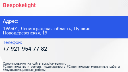 Bespokelight по адресу 196601, Ленинградская область, Пушкин, Новодеревенская, 19 в дальнейшем Организация, размещена в следующих категориях: