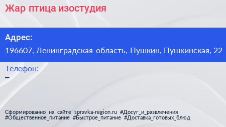 Жар-птица, изостудия по адресу 196607, Ленинградская область, Пушкин, Пушкинская, 22 в дальнейшем Организация, размещена в следующих категориях:
