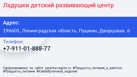 Ладушки, детский развивающий центр по адресу 196601, Ленинградская область, Пушкин, Дворцовая, 6 в дальнейшем Организация, размещена в следующих категориях: