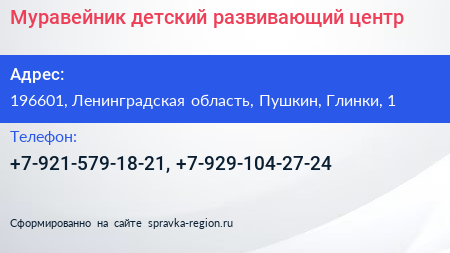 Муравейник, детский развивающий центр по адресу 196601, Ленинградская область, Пушкин, Глинки, 1 в дальнейшем Организация, размещена в следующих категориях: