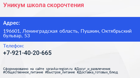 Уникум, школа скорочтения по адресу 196601, Ленинградская область, Пушкин, Октябрьский бульвар, 53 в дальнейшем Организация, размещена в следующих категориях: