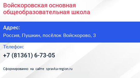 Войскоровская основная общеобразовательная школа по адресу Войскоровская средняя общеобразовательная школа, 3, 41К-884, Войскорово, Тельмановское городское поселение, Тосненский район, Ленинградская область, Северо-Западный федеральный округ, 187002, Россия в дальнейшем Организация, размещена в следующих категориях:
