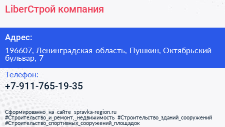 LiberСтрой, компания по адресу 196607, Ленинградская область, Пушкин, Октябрьский бульвар, 7 в дальнейшем Организация, размещена в следующих категориях: