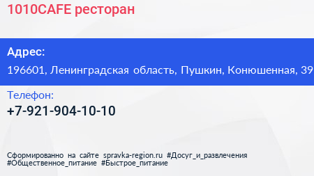 1010CAFE, ресторан по адресу 196601, Ленинградская область, Пушкин, Конюшенная, 39 в дальнейшем Организация, размещена в следующих категориях: