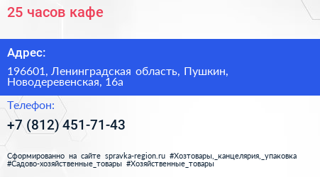 25 часов, кафе по адресу 196601, Ленинградская область, Пушкин, Новодеревенская, 16а в дальнейшем Организация, размещена в следующих категориях: