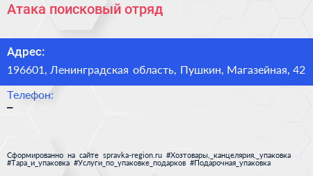 Атака, поисковый отряд по адресу 196601, Ленинградская область, Пушкин, Магазейная, 42 в дальнейшем Организация, размещена в следующих категориях: