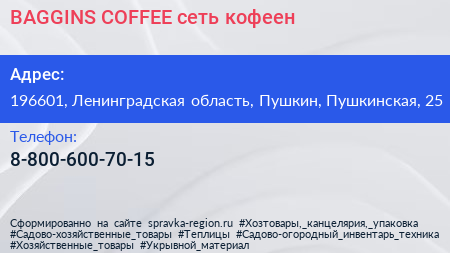 BAGGINS COFFEE, сеть кофеен по адресу 196601, Ленинградская область, Пушкин, Пушкинская, 25 в дальнейшем Организация, размещена в следующих категориях: