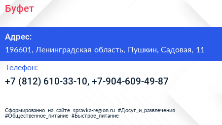 Буфет по адресу 196601, Ленинградская область, Пушкин, Садовая, 11 в дальнейшем Организация, размещена в следующих категориях: