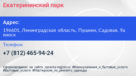 Екатерининский парк по адресу 196601, Ленинградская область, Пушкин, Садовая, 9а киоск в дальнейшем Организация, размещена в следующих категориях:
