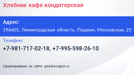 Хлебник, кафе-кондитерская по адресу 196601, Ленинградская область, Пушкин, Московская, 25 в дальнейшем Организация, размещена в следующих категориях: