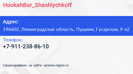 HookahBar_Shashlychkoff по адресу 196602, Ленинградская область, Пушкин, Гусарская, 9 к2 в дальнейшем Организация, размещена в следующих категориях: