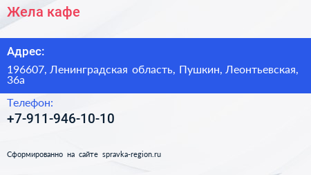 Жела, кафе по адресу 196607, Ленинградская область, Пушкин, Леонтьевская, 36а в дальнейшем Организация, размещена в следующих категориях: