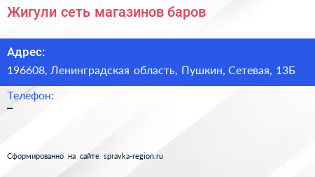 Жигули, сеть магазинов-баров по адресу 196608, Ленинградская область, Пушкин, Сетевая, 13Б в дальнейшем Организация, размещена в следующих категориях: