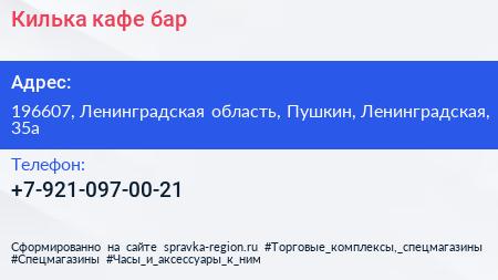 Килька, кафе-бар по адресу 196607, Ленинградская область, Пушкин, Ленинградская, 35а в дальнейшем Организация, размещена в следующих категориях: