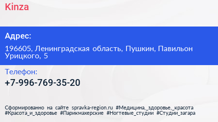 Kinza по адресу 196605, Ленинградская область, Пушкин, Павильон Урицкого, 5 в дальнейшем Организация, размещена в следующих категориях: