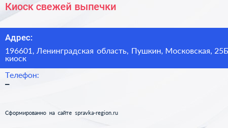 Киоск свежей выпечки по адресу 196601, Ленинградская область, Пушкин, Московская, 25Б киоск в дальнейшем Организация, размещена в следующих категориях: