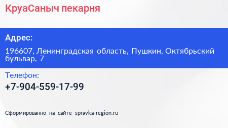 КруаСаныч, пекарня по адресу 196607, Ленинградская область, Пушкин, Октябрьский бульвар, 7 в дальнейшем Организация, размещена в следующих категориях: