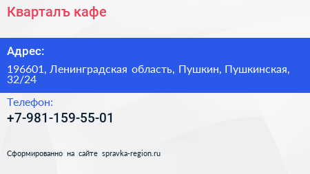 Кварталъ, кафе по адресу 196601, Ленинградская область, Пушкин, Пушкинская, 32/24 в дальнейшем Организация, размещена в следующих категориях: