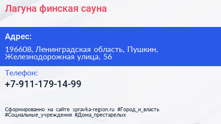Лагуна, финская сауна по адресу 196608, Ленинградская область, Пушкин, Железнодорожная улица, 56 в дальнейшем Организация, размещена в следующих категориях: