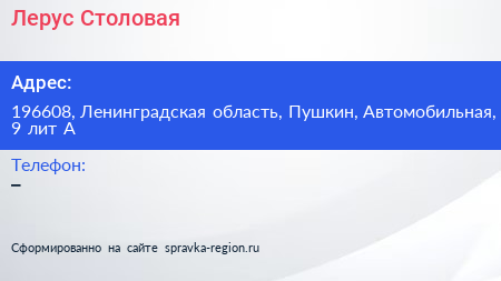 Лерус, Столовая по адресу 196608, Ленинградская область, Пушкин, Автомобильная, 9 лит А в дальнейшем Организация, размещена в следующих категориях: