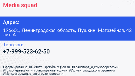 Media squad по адресу 196601, Ленинградская область, Пушкин, Магазейная, 42 лит А в дальнейшем Организация, размещена в следующих категориях:
