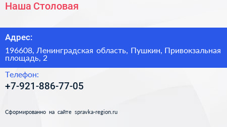 Наша Столовая по адресу 196608, Ленинградская область, Пушкин, Привокзальная площадь, 2 в дальнейшем Организация, размещена в следующих категориях:
