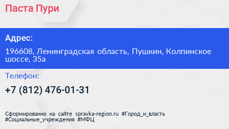 Паста & Пури по адресу 196608, Ленинградская область, Пушкин, Колпинское шоссе, 35а в дальнейшем Организация, размещена в следующих категориях: