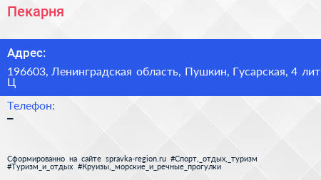 Пекарня по адресу 196603, Ленинградская область, Пушкин, Гусарская, 4 лит Ц в дальнейшем Организация, размещена в следующих категориях: