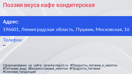 Поэзия вкуса, кафе-кондитерская по адресу 196601, Ленинградская область, Пушкин, Московская, 16 в дальнейшем Организация, размещена в следующих категориях: