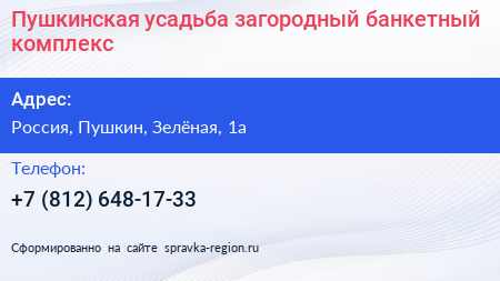 Пушкинская усадьба, загородный банкетный комплекс по адресу Загородный банкетный комплекс "Усадьба Пушкинская", 1, Вуоксовская улица, Ладога, Фёдоровское городское поселение, Тосненский район, Ленинградская область, Северо-Западный федеральный округ, 187046, Россия в дальнейшем Организация, размещена в следующих категориях:
