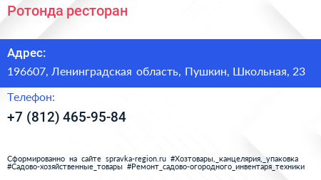 Ротонда, ресторан по адресу 196607, Ленинградская область, Пушкин, Школьная, 23 в дальнейшем Организация, размещена в следующих категориях:
